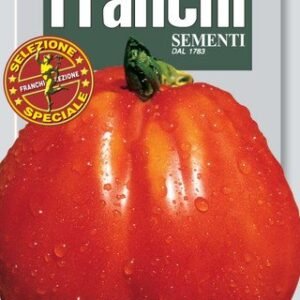 Tomato ‘Red Pear Franchi’ of Bergamo (Solanum lycopersicum L.) is a magnificent heritage variety, celebrated for its unique and striking appearance as much as its superb flavour. As featured on BBC Gardeners’ World, this indeterminate (cordon) tomato produces large, heavy fruits weighing up to 220-230g, with a distinct pear shape, deep red skin, and pronounced vertical ribs.